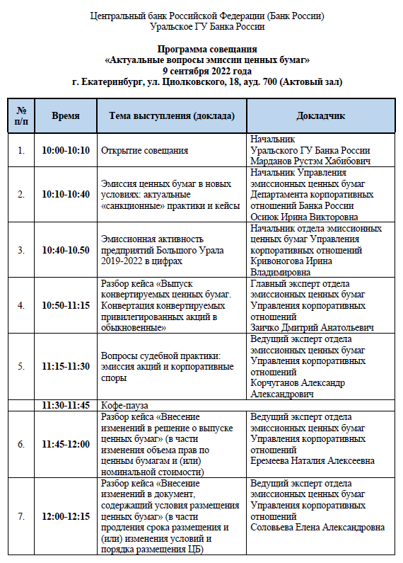 Отделение по Тюменской области Уральского главного управления Банка России 9 сентября 2022 года состоится совещание в офлайн и онлайн формате на тему «Актуальные вопросы эмиссии ценных бумаг».