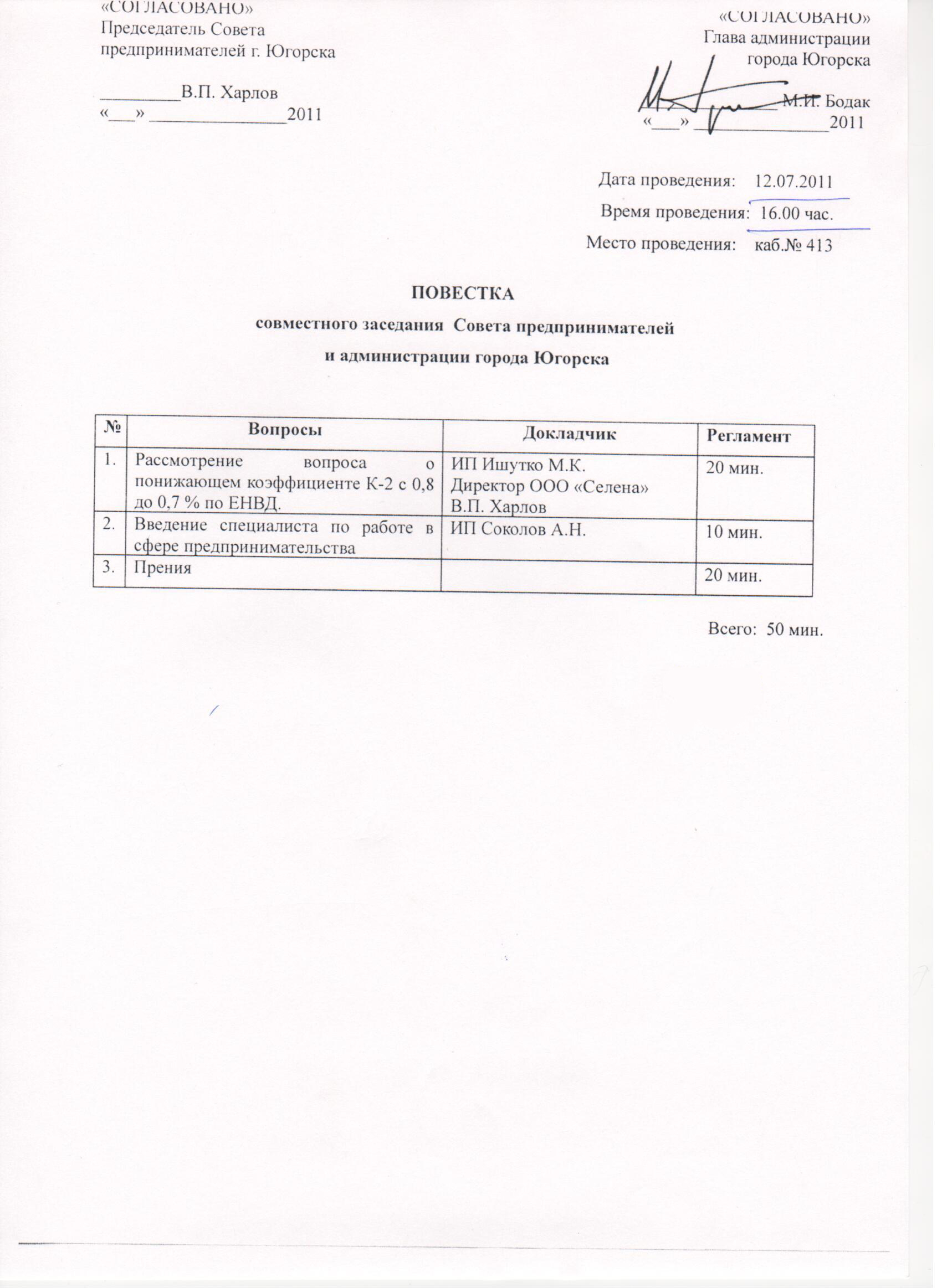 повестка | 12.07.2011 | 16.00 | 413 кабинет администрации города |