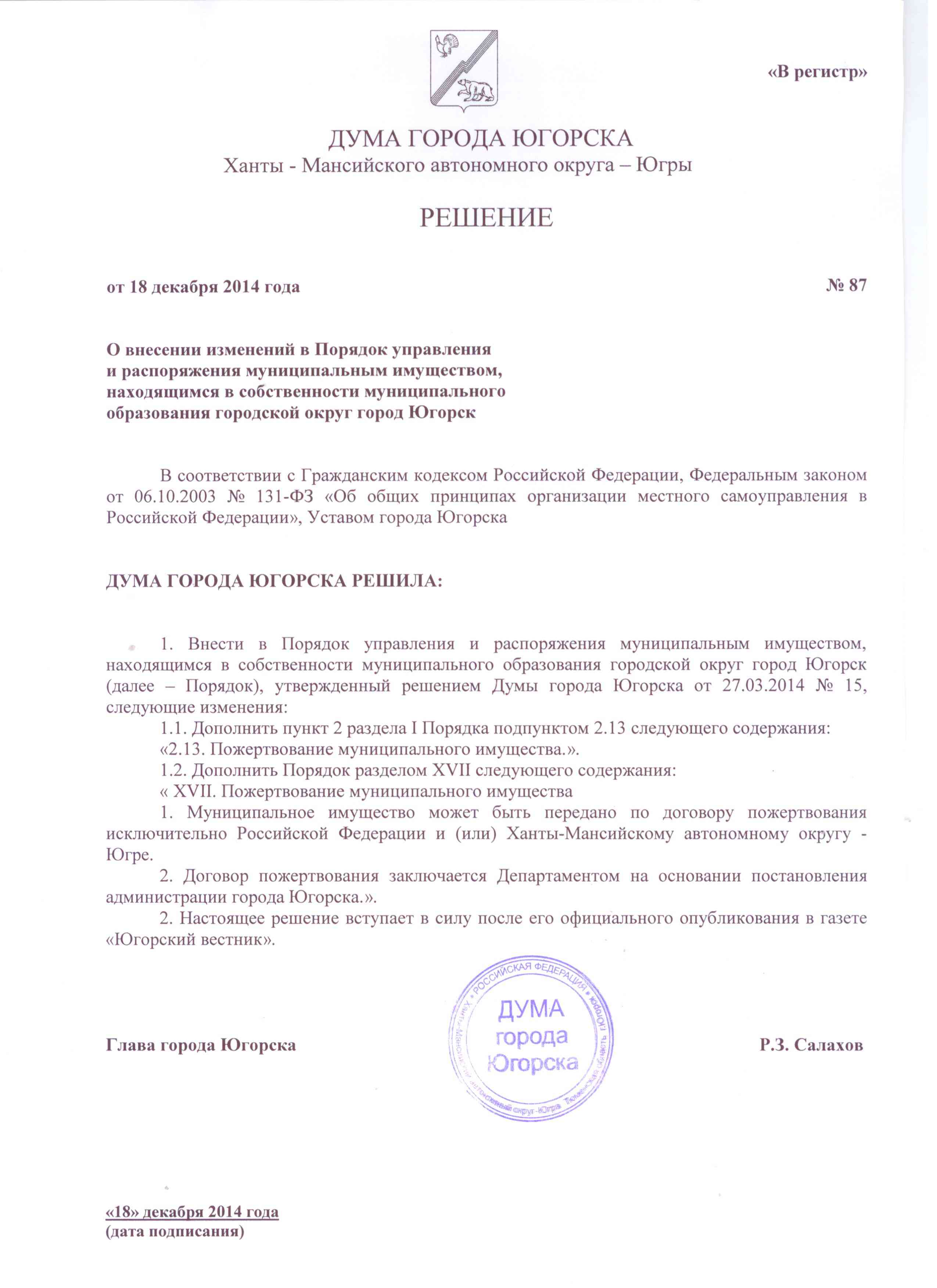 Решение Думы города Югорска от 18.12.2014 № 87